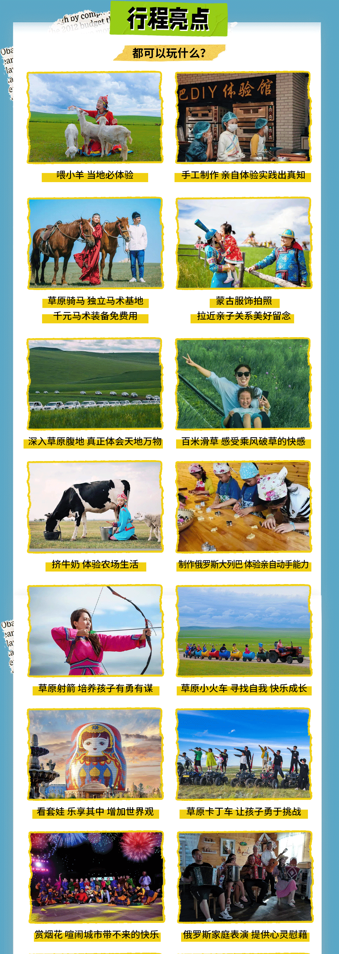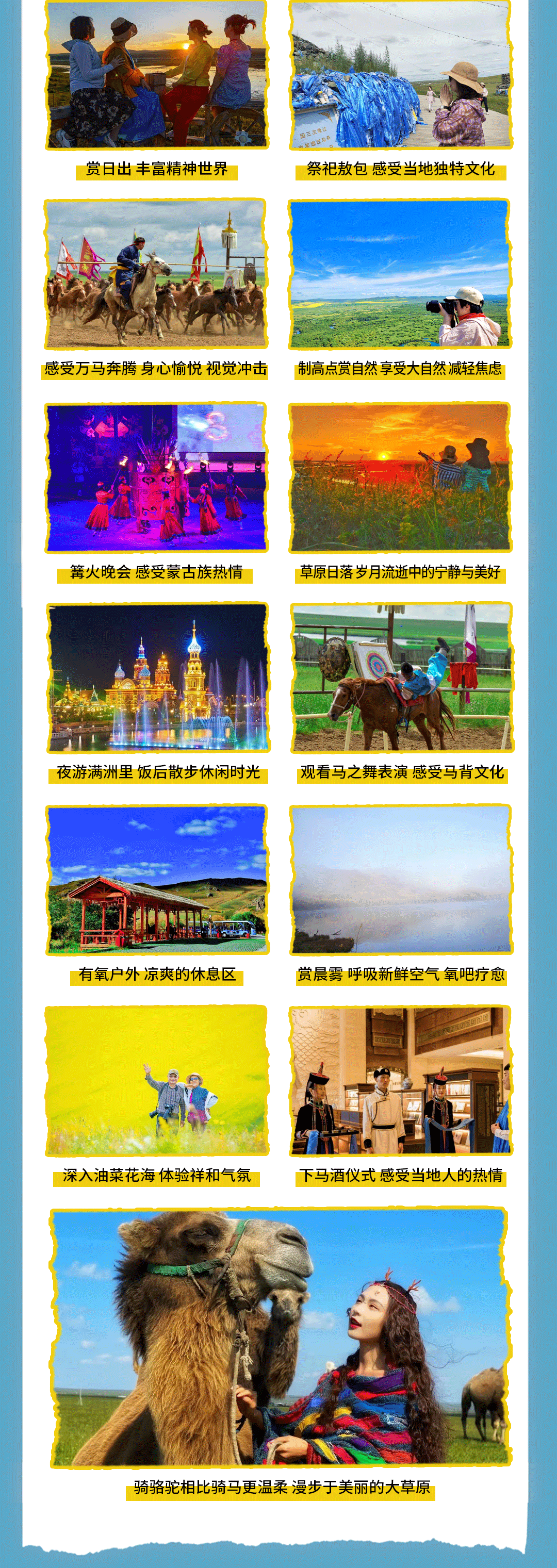 7.贈(zèng)送娛樂項(xiàng)目:穿蒙古服飾拍照、擠牛奶、喂小羊、草原托馬斯、品嘗蒙古小吃、祭祀敖包、蒙古小課堂、蒙古燒燙氈畫、網(wǎng)紅天梯打卡、篝火晚會(huì)、民族樂器展示、夜游滿洲里、旅行社責(zé)任險(xiǎn)人身意外險(xiǎn)(雙重保險(xiǎn)為我們的旅行保駕護(hù)航)