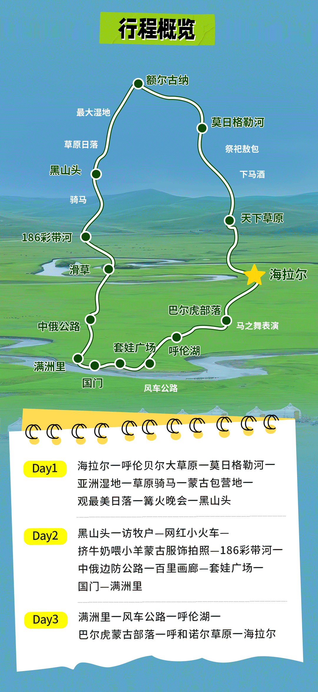 注: 此線路是8字形線路,我們不走回頭路!行程覆蓋原生態(tài)草原、濕地、森林、河流、晨霧、日落、走入蒙古族、俄羅斯、鄂溫克族人民家庭,體驗(yàn)草地人、游牧人簡(jiǎn)單質(zhì)樸的生活。