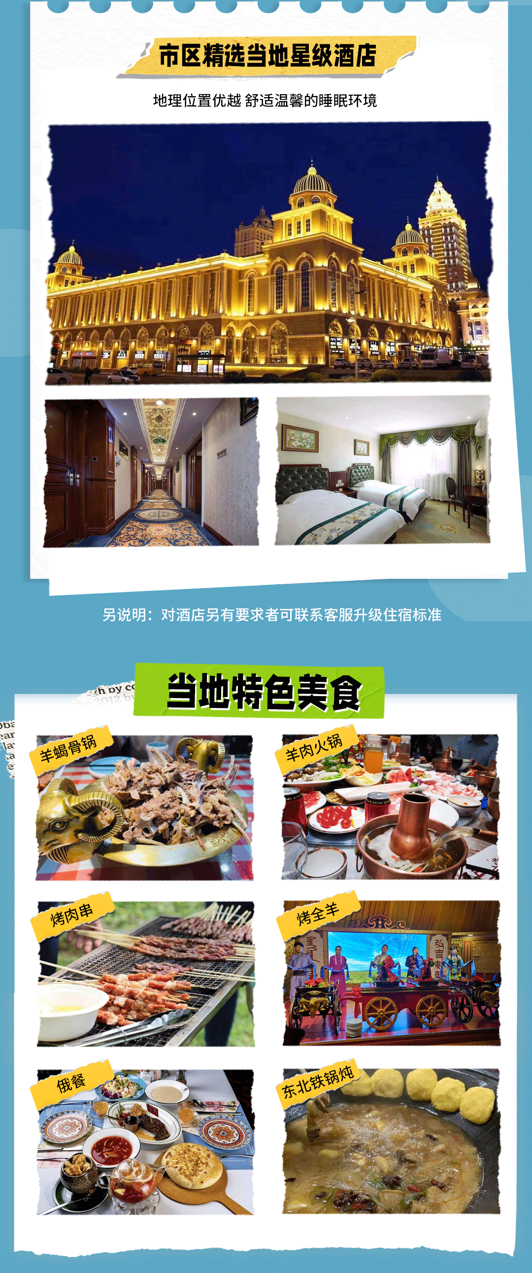 ②套餐住宿:江南大酒店、鑫友誼俄式酒店、滿洲里大飯店、滿洲里呼倫國(guó)際大酒店、凱旋大酒店、羅曼假日酒店、外交會(huì)館、福潤(rùn)興酒店、盧布里俄式酒店