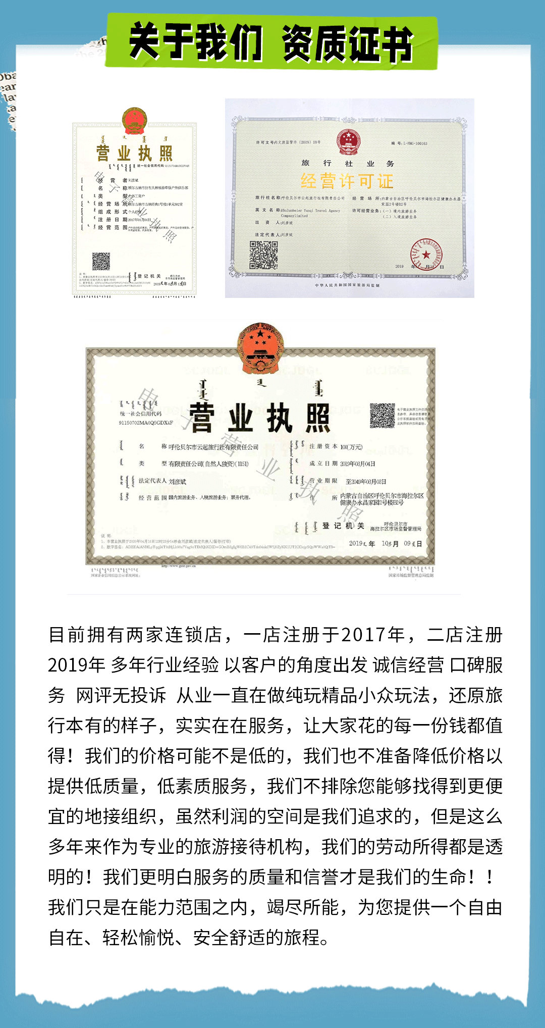 3.眾多好評(píng)口碑宣傳,我們專注戶外純玩原生態(tài)體驗(yàn)式旅行、行程為八字環(huán)線不走回頭路避免重復(fù)路程,會(huì)讓您的呼倫貝爾之旅不虛此行