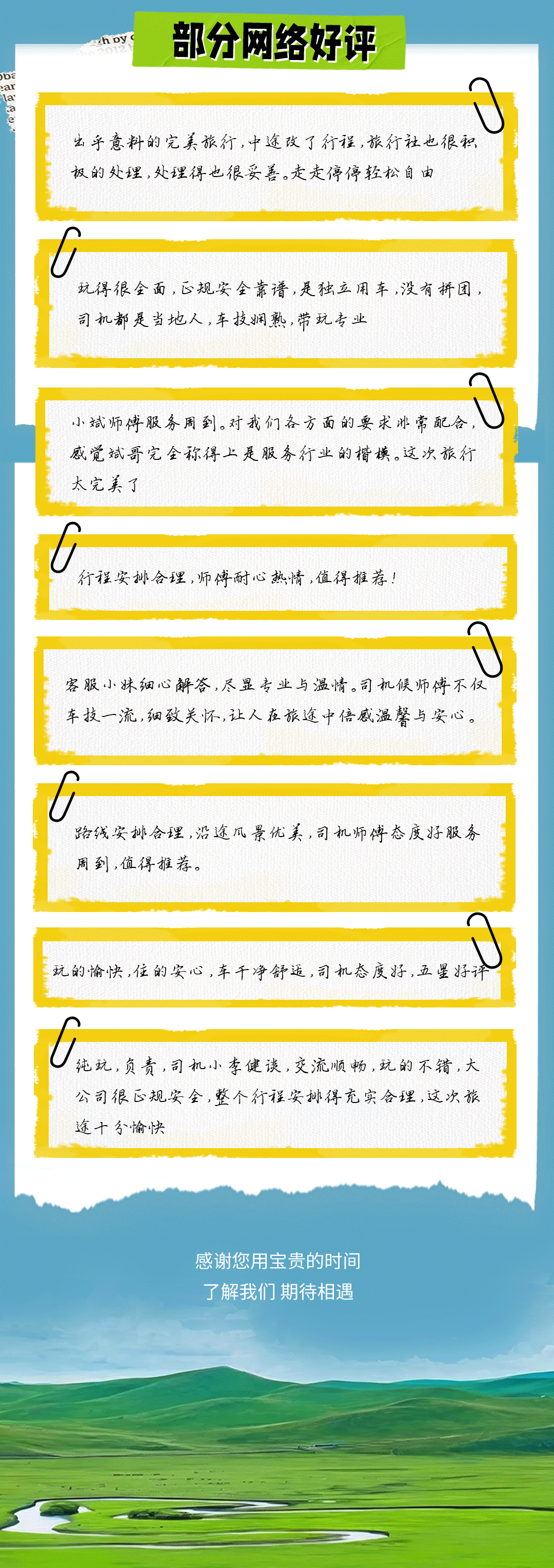 1. 免費(fèi)接機(jī)/火車安排當(dāng)晚住宿,小眾玩法,此線路感受沒有被商業(yè)化的原生態(tài)大自然美景,短暫的離開現(xiàn)實(shí)生活 親近大自然 讓您感受游牧文化 ,給您和家人多一次陪伴旅行 情侶多一次親密感 老人多一份健康 孩子多一次體驗(yàn), 我們用心規(guī)劃旅行一定讓您消費(fèi)的值得 更豐富的人生體驗(yàn)